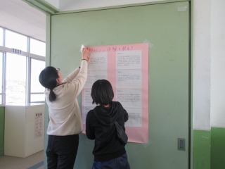 2年生の保護者の方にも見てもらえるように、2年フロアに掲示しています。懇談等でおいでになったときに是非ご覧ください。