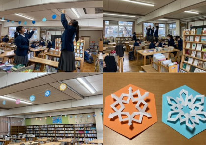 「窓ふき、本棚移動、本のラベルはがしなど、1年間の汚れをスッキリ綺麗に落としてくれました。仕上げに、先日の図書委員会で作成した《雪の結晶》をガーランドにして飾ってくれて、バージョンアップした学校図書館に!図書委員会のみんな、ホントにありがとう!