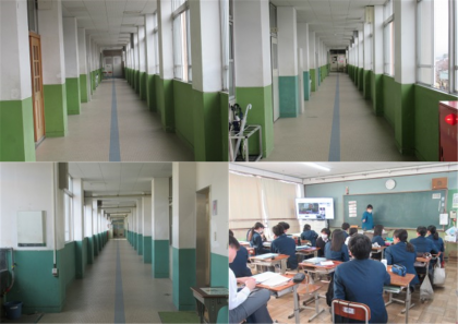 (下の写真は、チャイムが鳴る前の廊下。そして、もうすでに着席している教室の様子です)