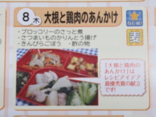 今日の給食は、「第1回 中学校給食レシピアイデア募集」で最優秀賞に選ばれた、S中学校2年生のレシピアイデアをアレンジした「大根と鶏肉のあんかけ」が登場します。