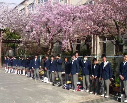 生徒会本部の生徒が,毎朝「おはようございます」のあいさつで迎えてくれます。ふだんは生活委員会の活動なのですが,まだ委員会活動が始まっていないので,本部が頑張っています。いっしょにやってくれる友達にも声をかけて,今日は48人が元気な声で迎えてくれました。