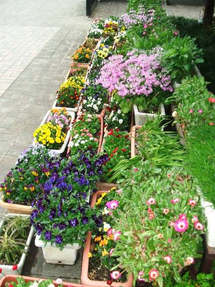 正門を入ると,色とりどりの花が迎えてくれます。冬の寒さに耐えた,緑のカーテンのスナップエンドウのつるも,グングン伸びています。