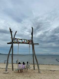 伊江ビーチにて。透き通った海水に、やっぱり足だけでもつけたくなるようで、多くの子達が集まってきています。