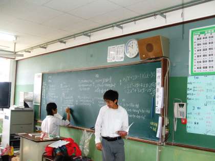 3年生の数学です。自分が解いた問題の解き方と答えを黒板に書いて,みんなに説明します。