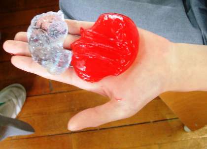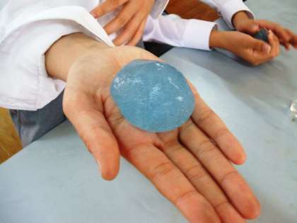 理科部が実験していました。正解は…硼砂水(アルカリ性)+水糊(中性)+水(中性)で,アルカリ性でした。