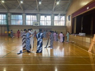 前回の華道体験に引き続き、1年生や1組の子どもたちが伝統文化に親しみ,日本の心を伝える古典の振興に資するよう,家庭科の時間に和装体験に取り組みました。正座礼から始まり、浴衣の着方、帯結び、たたみ方を学びました。日本の伝統文化に触れることのできる有意義な時間を過ごせました。