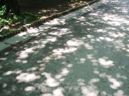 左の写真は,1−6教室の中庭側の窓です。桜の葉が,すぐ目の前に迫っています。葉の間から差し込む光が,気持ちいいです。右の写真は,中庭の「桜のトンネル」です。生い茂った桜の葉からの木漏れ日が,爽やかさを運んできてくれます。