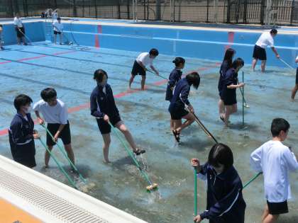 本日、体育委員とバスケ部の皆さんでプール清掃を行い、ピカピカになりました!