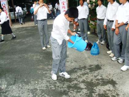 「脱エアコン!自然で涼しくなろう」をテーマに,評議会は今回の3C活動に取り組んでいます。朝は挨拶運動の声が行き交う中,打ち水をしています。本当に,涼しくなりますよ。N先生いわく,「本当に気温が下がっているみたい!」。本当なんです。科学的にも証明されているそうですよ。