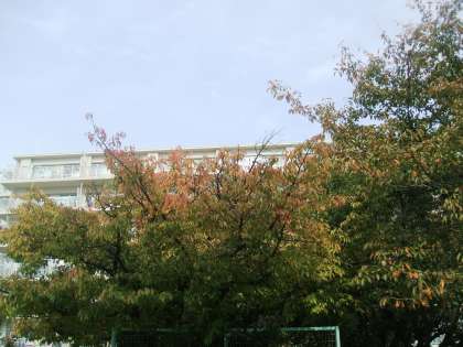 校内の紅葉が,進んできました。中庭の植え込みの中の,紅葉のじゅうたんもだいぶしっかりと敷かれてきました。じゅうたんは,まだまだもっと厚く,しかも色鮮やかなものが敷かれますよ。