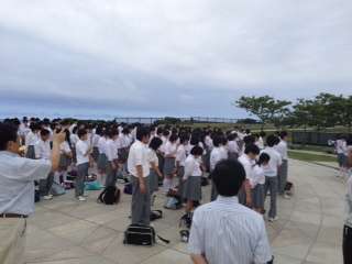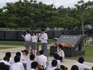 平和公園で「平和セレモニー」を行いました。「平和への誓い」「千羽鶴奉納」を行い、平和についてみんなで考えました。