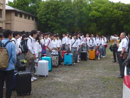 深夜からの雨も上がり、予定通り結団式を行うことができました。修学旅行の始まりです。添乗員さん・写真屋さん3日間よろしくお願いします。