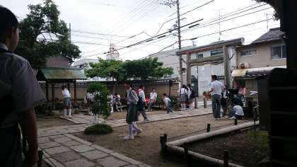 斎宮神社、学校へ戻る道すじでたくさんのグループがやってきました。太秦中学校、貸し切り状態です。さあ、あとひとがんばり学校へ戻りましょう!
