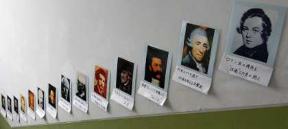 音楽室前です。今にも音が聞こえてきそうです。うーん,この作曲家は誰やったっけ…。下の紙をめくると,名前が登場します。