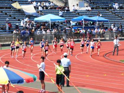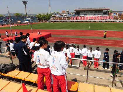 陸上部です。西京極陸上競技場をいっぱい使って,いろんな種目をやっています。太秦中陸上部は,チームワークばっちり!カッコいい応援です。