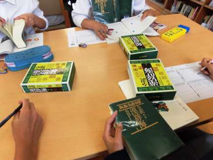 今日の3年生の国語は,図書館で行われています。図書支援員の先生にもアドバイスしてもらいながら,辞書で熟語について調べています。辞書を使う機会がめっきり減ってきている現代。でも,使い方はしっかりと身に付けておきましょう。