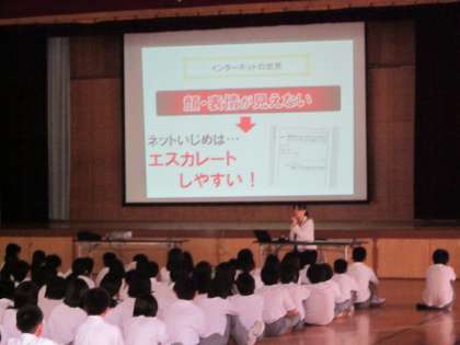 ケータイの楽しさ、便利さの裏に隠れた危険性を実例を紹介しながら、わかりやすく教えてもらいました。生徒も食い入るように見ていました。何も知らないで使っていると、被害者になったり、加害者になったりして取り返しのつかないことになることがよくわかりました。どちらにもならないようにしてもらいたいものです。