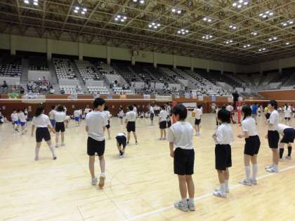 1組が,府立体育館で行われている合同球技大会に参加しています。たいへん暑い中ですが,午前中は梅津中学校と合同チームでバレーボールの試合をしました。1戦目は,みごと勝利を収めました。