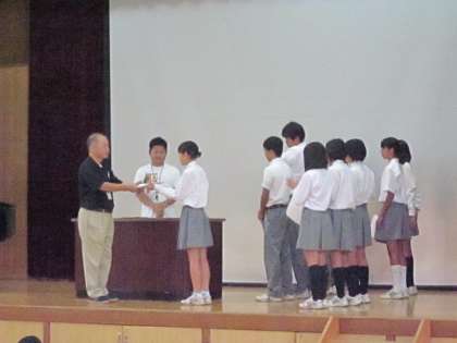 夏休みを前に集会を開きました。集会に先立ち、春から夏にかけての大会の表彰と3年生の「よい歯の表彰」を行いました。