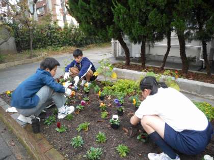 園芸部さんとボランテイアの生徒さんで花植えを行いました。