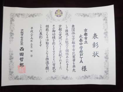 太秦中学校PTAが,市民憲章推進者区長表彰を受賞しました。本年度は,日本PTA全国協議会,PTAフェスティバル広報紙コンクール優秀賞と併せ,いろんなところで今までのPTAの活動が評価された一年でした。