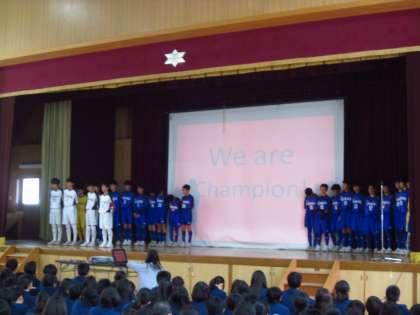 春の大会の活躍を期待し、体育館で春体激励会が行われました。各部、目標とともに決意を発表しました。がんばれ、太秦中、今年も好成績を期待しています。