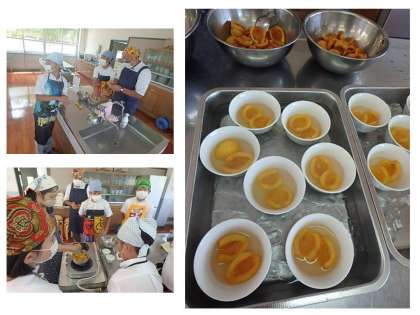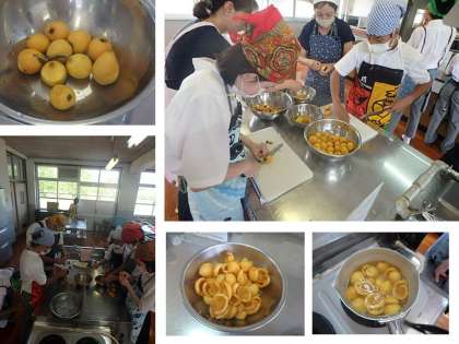 10組の調理実習の様子です。びわのジュレを作りました。