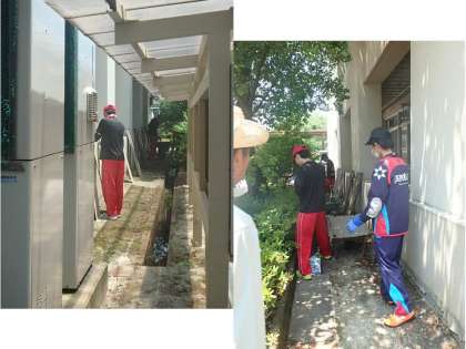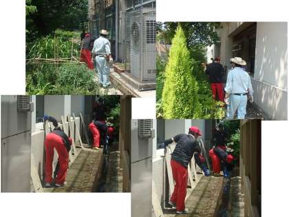 三菱自動車工業株式会社・京都製作所京都工場より,新人研修で,7名の方が嵯峨中学校に来られました。普段はエンジンの作り方の勉強や実習をされているそうですが,今回,研修の一環として,地域でのボランティア活動をされています。先週は広沢小学校に行かれ,今日は嵯峨中学校で作業をされています。