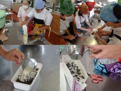 レンジから取り出し,型として牛乳パックを使っているチームは,紙パックの上の部分を切り取りました。そしてみんなで甘納豆を入れてならし,残しておいた液を流し込んで,再びレンジにいれ,2分半加熱します。