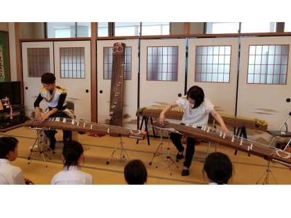 7月8日土曜日,埼玉から「箏男kotomen 大川義秋」さん,大阪から「やよい」さんが来て下さり,,嵯峨中学校和室にて,ミニコンサートが開催されました。普段伝統文化部が練習しているお箏がまるで生まれ変わったかのように,とても素敵な音色を奏で,生徒達も聴き入っていました。