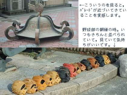 今朝の学校の様子です。パレードに向けての準備に日々取り組んでいますが,今日は,御輿を乗せる台車が出されました。朝練に取り組む部活動でお手伝いをしたりしていました。