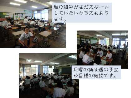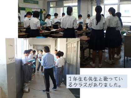 中校舎の3階から2階へ降りると,1年生が朝練に取り組んでいました。担任の先生が一緒に歌いながらの練習です。でも同じ階のもう1つの1年生のクラスはまだやっていませんでした。明日からするのでしょうか?生徒達は余裕のようでしたが…。