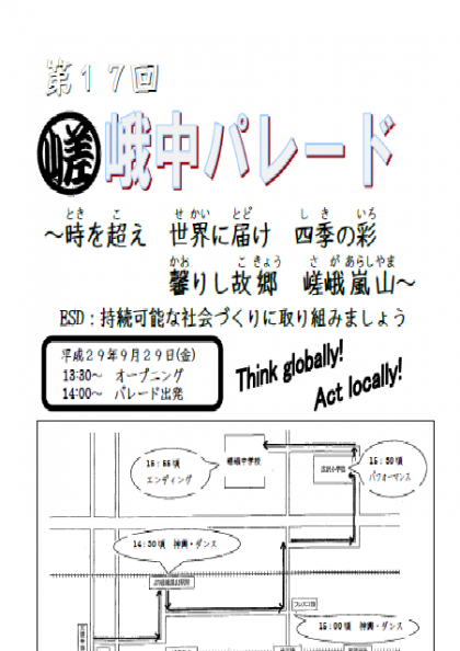 校内に掲示されている,第17回嵯峨中パレードのポスターを,配布文書のところに掲載しました。
