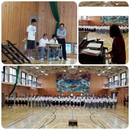1,2時間目,1年生は合唱コンクールのリハーサルを行いました。森田記念ホールの通りに体育館に集合し,1年生2人の司会進行で,まず,全校合唱の練習を行いました。