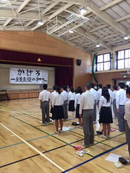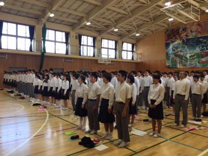 体育館に3年生が集まり,学年合唱,クラス合唱,入退場練習をしました。