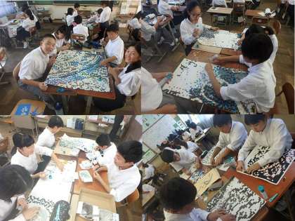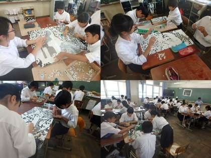 嵯峨中フェスタに向けて,1年生では貼り絵に取り組んでいます。今日の終了時点で8〜9割の完成を目指して,午後の2時間頑張りました。随分白いところがなくなってきています。