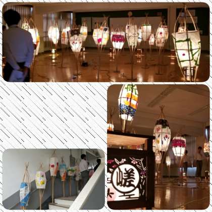 1・2年の体育大会優勝団(青組)が作成した竹行灯が,室内や階段に所狭しと並べられています。