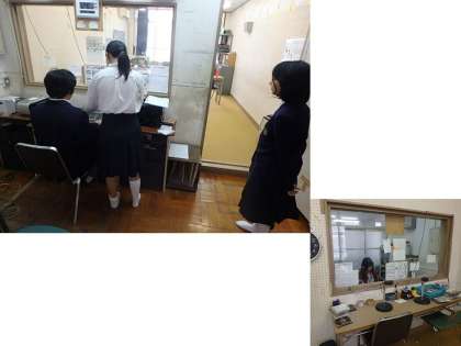 報道部は,朝と昼に校内放送をしています。この写真は「お昼の校内放送」の時間の写真です。毎日報道部員が交代で役割を決め,まずは伝達放送を行います。図書当番や水やり当番の話をしたあとは,食育担当が放送による「食ing NEWS」を放送しています。今日が75回目の放送でした。そのあと,生徒の皆さんからのリクエストによる音楽が流されています。