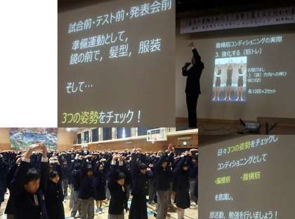生徒のみなさんは,日々3つの姿勢をチェックし,コンディショニングとして「腸腰筋」と「腹横筋」を意識し,部活動,勉強に励みましょう。