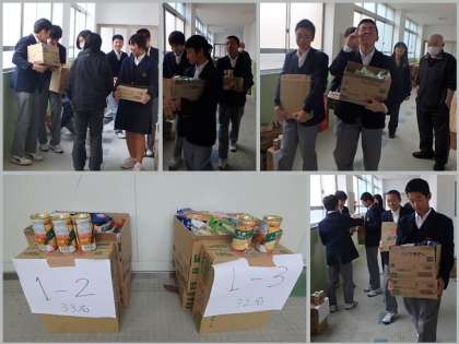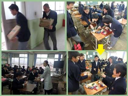 今日の終学活前に,生徒達には,愛宕登山競走を終えたときに配布される予定だったパンと飲物が渡されました。各クラスから3〜4名配膳室前に取りに来て,そのあとはクラス毎に担任より配布です。1つずつ前からとって後ろに回すクラスや,班ごとに配布されてじゃんけんをするクラスなど,カラーが出ていて面白かったです。