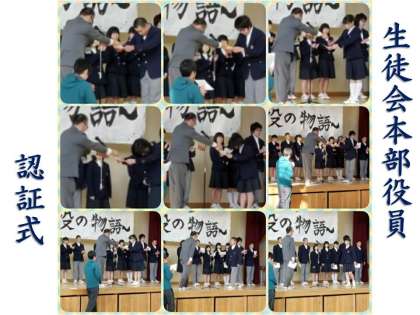 まず,新しく発足した生徒会のメンバーに認証状が渡され,生徒会旗が引き継がれました。旧生徒会長は,「しんどいこともあったけど,49期の会長を務めて良かった。周りの人に恵まれて,無事任期を終えて,かけがえのない1年間になった」と話しました。「優しく厳しく見守って下さった先生方,こんな私についてきてくれた嵯峨中の仲間を心から誇りに思います」とも話してくれました。そして50期の生徒会メンバーに対して,「自分の思っているより辛くて大変なこともあると思うけど,13人力をあわせて乗り越え,任期を終えて欲しいです」とエールを送りました。