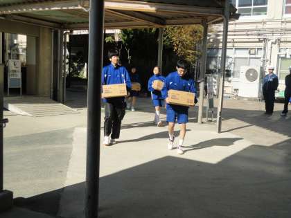 届けられた飲料水を体育館に運び入れました。また,ごみ箱用段ボールを組み立て設置しました。