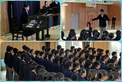 歌は,音楽科の先生が指導に来て下さり,何度か練習をしました。指揮者も自分の表情を動画で見てチェックし,みんなが休憩しているときもピアノ伴奏と合わせる練習をしたり,と,とても熱心です。指揮者の額には汗がにじんでいました。