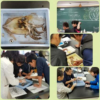 ▼理科「楽しい実験教室」という講座で,イカの解剖を行っていました。興味津々で取り組んでいました。男子児童より,女子児童の方が物怖じせず大胆にやっているようでした。