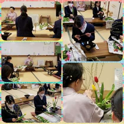 伝統文化部は,今日,いけばなを行いました。今日のテーマは「春の輝き」。今日の花材は,
