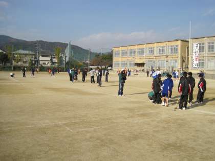 11月28日(日)秋らしい爽やかな好天の中,少年補導委員会主催のグランドゴルフ大会が嵯峨中学校で実施されました。三支部合同(嵯峨・嵐山・広沢)のこのスポーツ大会は,中学生の健全育成に寄与するために続けられてきましたが,30年以上続いています。当日の朝早くから,43人の少年補導委員の方が準備・運営に当たっていただきました。100人程度の嵯峨中生が参加し,6人が1グループとなり,教師チームも2チーム参加して,団体戦を行いました。ルール説明のあと,少年補導委員の方が審判となり,始まりましたが,一打一打に歓声をあげ,参加した中学生は競技を大いに楽しんでいました。