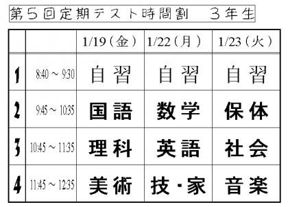 明日から3年生は,第5回定期テストです。このテストが,3年生にとっては中学校生活最後のテストになります。体調に気をつけて頑張ってください。