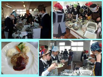 今日の4限に,2年1組が,「ハンバーグ&付け合わせ」の調理実習を行いました。どの班も取りかかりが素早かったのですが,やはり時間のかかる実習でした。