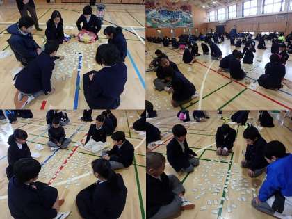 昨日,文化委員が準備,進行を行い,体育館で1年生の百人一首大会がありました。太鼓の合図で1年担当教員が五首ずつ交代で読み上げます。上の句が読まれ始めたらすぐに取る人もいて,寒かったですが,大変熱気にあふれていました。少しでも雰囲気が出れば,と,BGMに箏の生演奏も行いました。