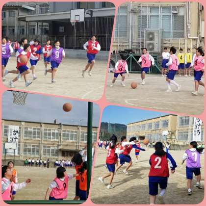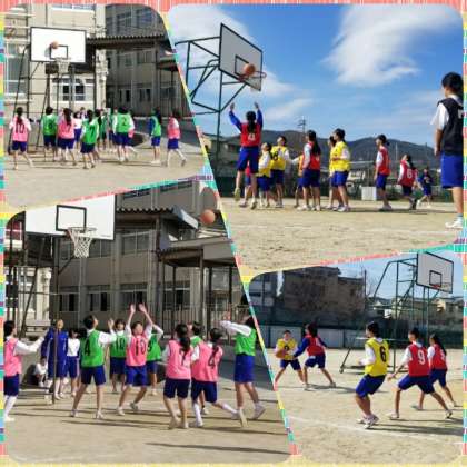 女子は南グラウンドでバスケットボールを行っています。1クラス4チームが5分ずつ試合を行います。みんな全力でプレイし,全力で応援しています。